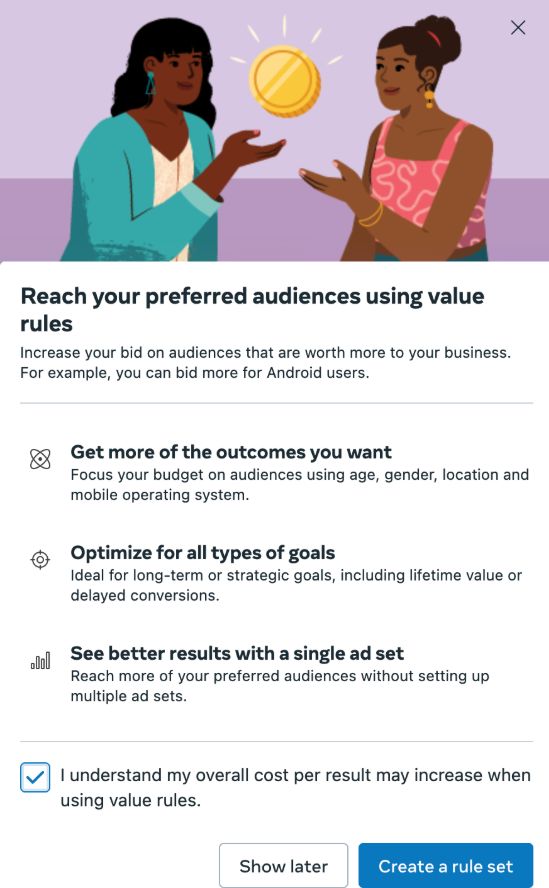 Il est possible de créer jusqu’à 10 règles, avec 2 critères par règle. Meta applique toujours la première règle pertinente dans la liste. Par exemple, si vous avez une règle pour augmenter les enchères de 20 % pour les femmes en Californie et une autre de 10 % pour les femmes utilisant iOS, seule la première sera appliquée à une femme californienne sur iOS.
