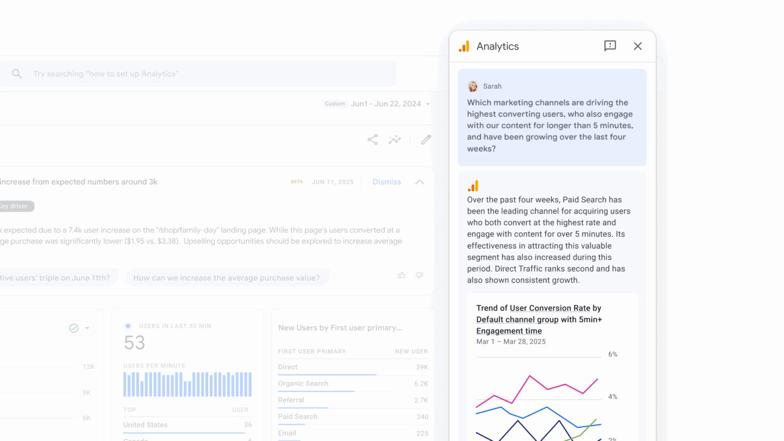 Dans Google Analytics : un agent “data expert” met en avant des insights visuels, tendances, et problèmes à résoudre, facilitant l’analyse et la prise de décision.